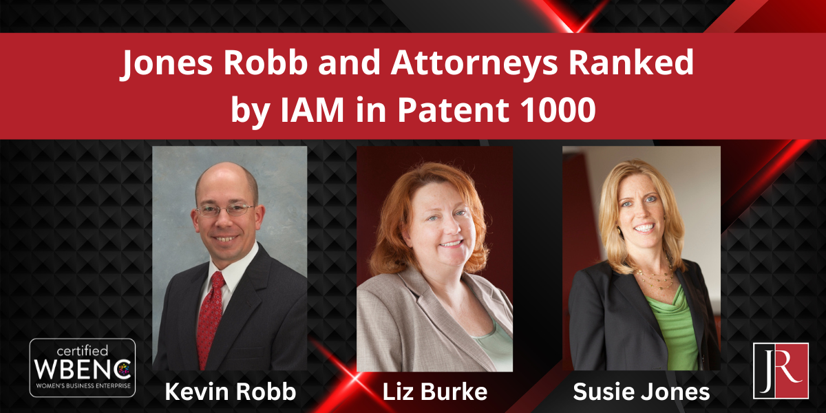 IAM Patent 1000 has ranked Jones Robb, along with attorneys Liz Burke, Susie Jones, and Kevin Robb, for excellence in patent prosecution. The global intellectual property publication cited the diversity and breadth of Jones Robbs’ technical and patent legal knowledge base, as well as their commitment and enthusiasm to their practice as standout attributes amongst peer organizations. Liz, Susie, and Kevin were recommended individually for the unique strengths each possesses and contributes to the firm’s success.